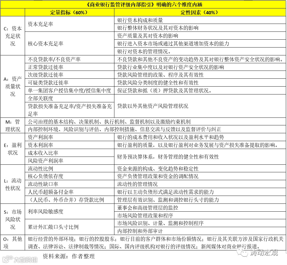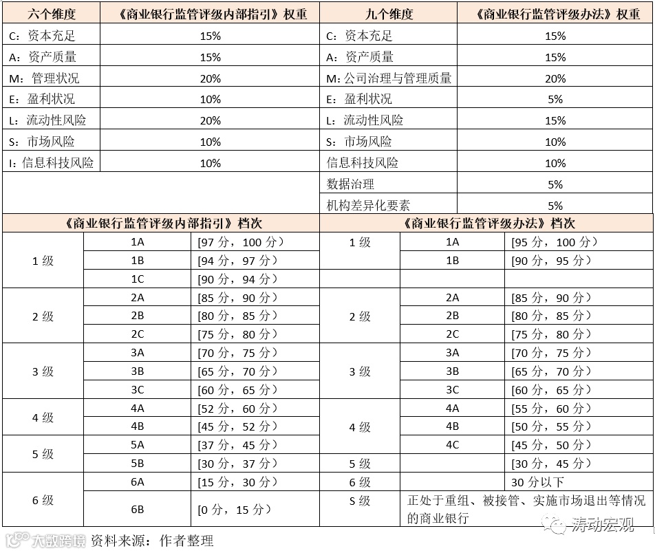 1、监管评级:依据《商业银行监管评级办法》