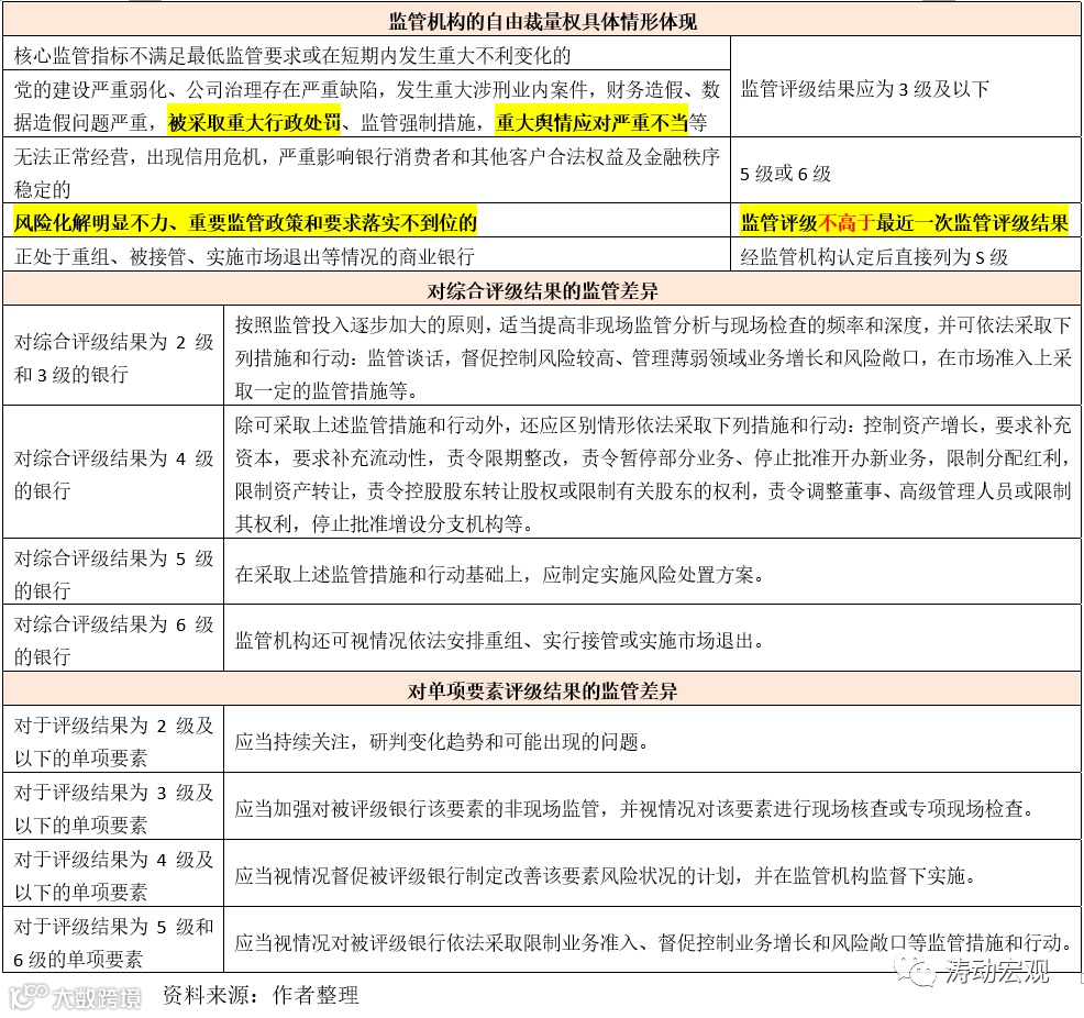 (5)监管机构可根据评级结果的差异,采取不同的监管举措,一般根据评级档次的高低,按照监管投入逐步加大的原则,适当提高监管力度。目前来看,只有评级结果为1级的银行,才可以豁免相应监管。