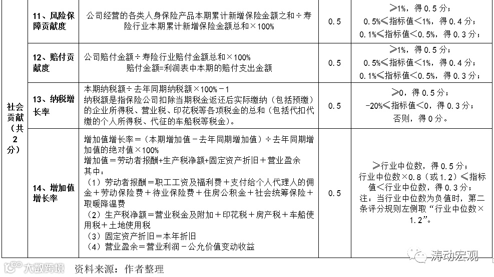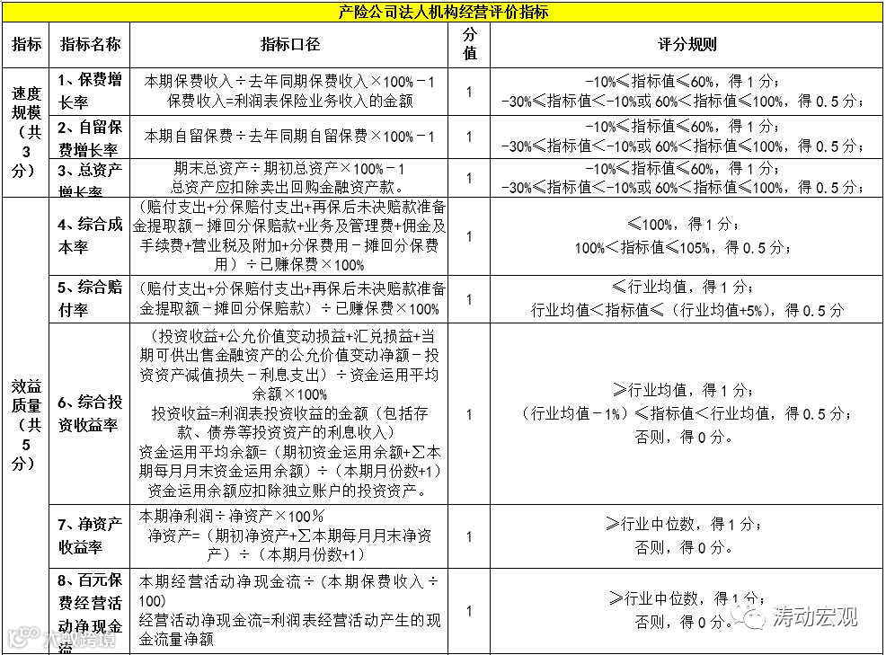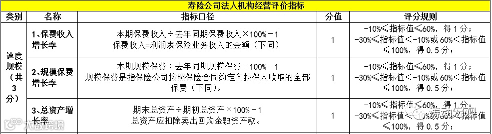 2、评价指标由定量指标组成,不包括定性指标,主要基于速度规模、效益质量和社会贡献三大类指标完成,其中寿险公司14个评价指标(分支机构13个)、产险公司12个评价指标(分支机构10个)。