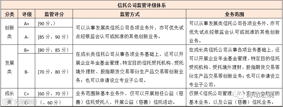 第三,信托公司的监管评级主要分为创新类、发展类和成长类三个大类,并进一步按照A、B、C分为六档,通常情况下只有评级结果在B-及以上的信托公司才能称之为良好。