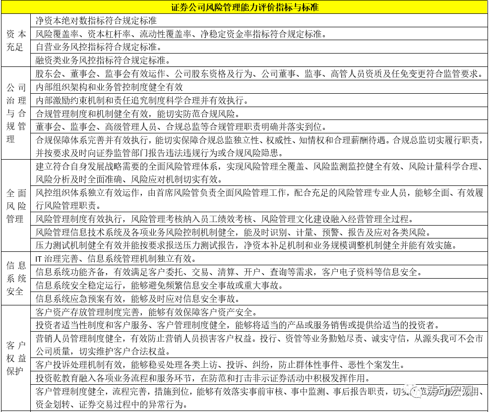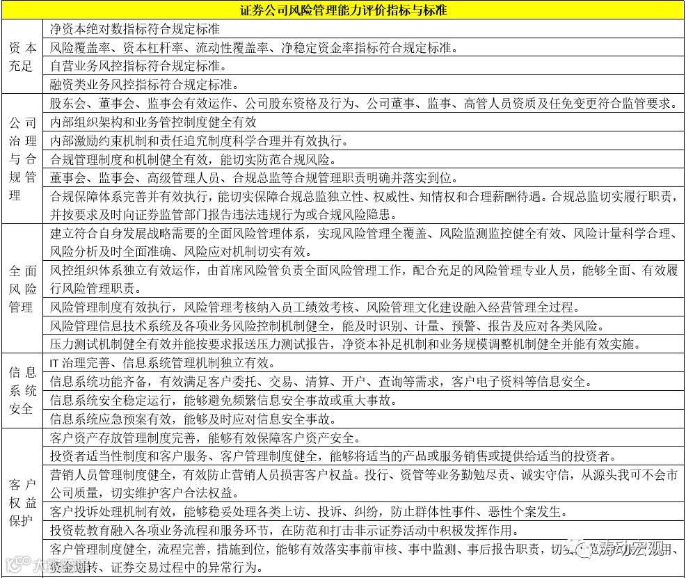 4、风险管理能力是证券公司评价体系的基础,主要包括资本充足、公司治理与合规管理、全面风险管理、信息系统安全、客户权益保护、信息披露等方面。