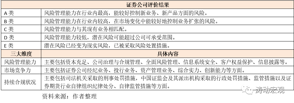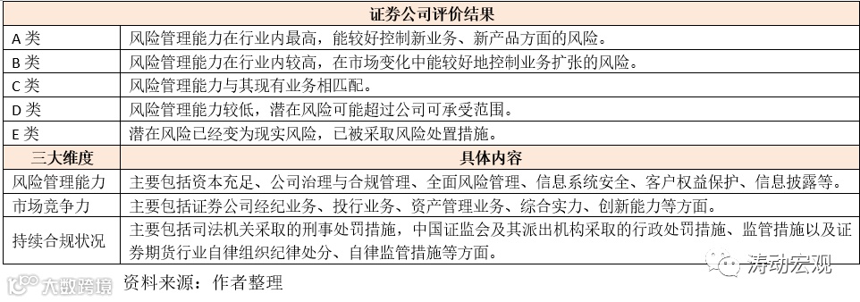 2、证监会主要根据2020年7月10日发布的《证券公司分类监管规定》(证监会公告〔2020〕42号)进行评价。这一文件最早于2009年5月26日发布,并分别于2010年5月14日、2017年7月6日以及2020年7月10日三次修订。证券公司的分类评价标准以风险管理能力为基础,主要依据《证券公司风险管理能力评价指标与标准》。可以说证券公司的分类评价体系是证监会体系下各机构评价的主要基准,诸如期货公司等其它金融机构的评价体系亦主要参考证券公司。
