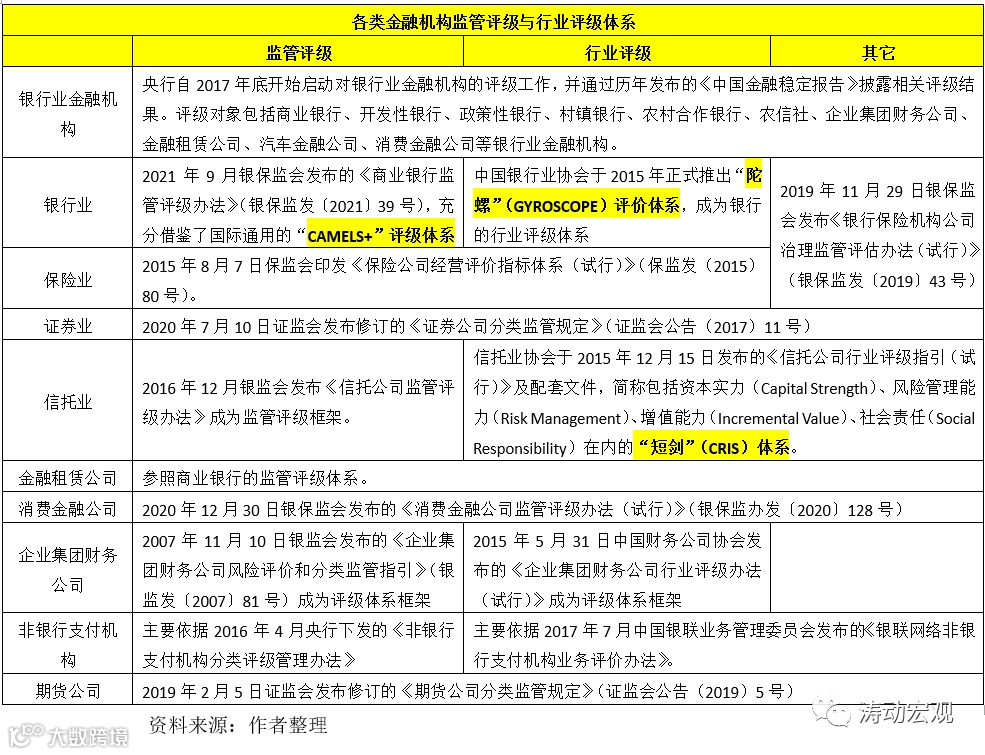 (三)一般情况下,监管部门负责相应的监管评级审定工作,行业协会则主要负责行业评级(结果通常会对外公开)。当然二者有时也会共用一套体系。