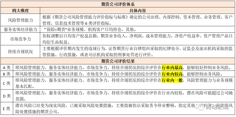 2、证监会主要根据2019年2月15日修订的《期货公司分类监管规定》(证监会(2019)第5号公告),对期货公司进行评级,事实上这一文件最早于2011年4月12日公布。同时,期货公司的评价标准仍以风险管理与控制能力为基础,主要依据《期货公司风险管理能力评价指标与标准》。