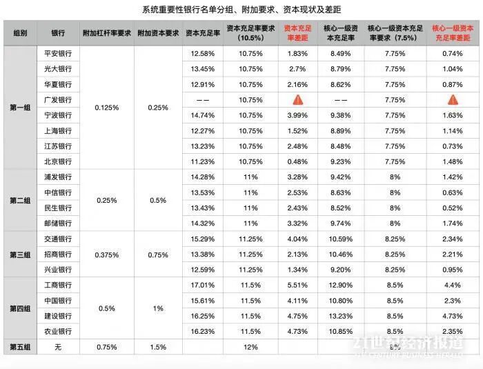 根据央行规定,系统重要性银行分为五组,分别适用0.25%、0.5%、0.75%、1%和1.5%的附加资本要求,附加杠杆率为附加资本的50%,分别为0.125%、0.25%、0.375%、0.5%和0.75%。不同组别系统重要性银行在恢复与处置计划、信息报送与披露、公司治理等方面的要求是相同的。