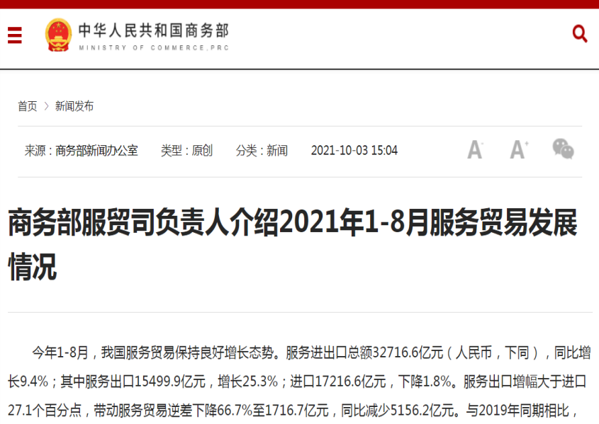 商务部服贸司负责人介绍2021年1-8月服务贸易发展情况时表示,今年1-8月,我国服务贸易保持良好增长态势。