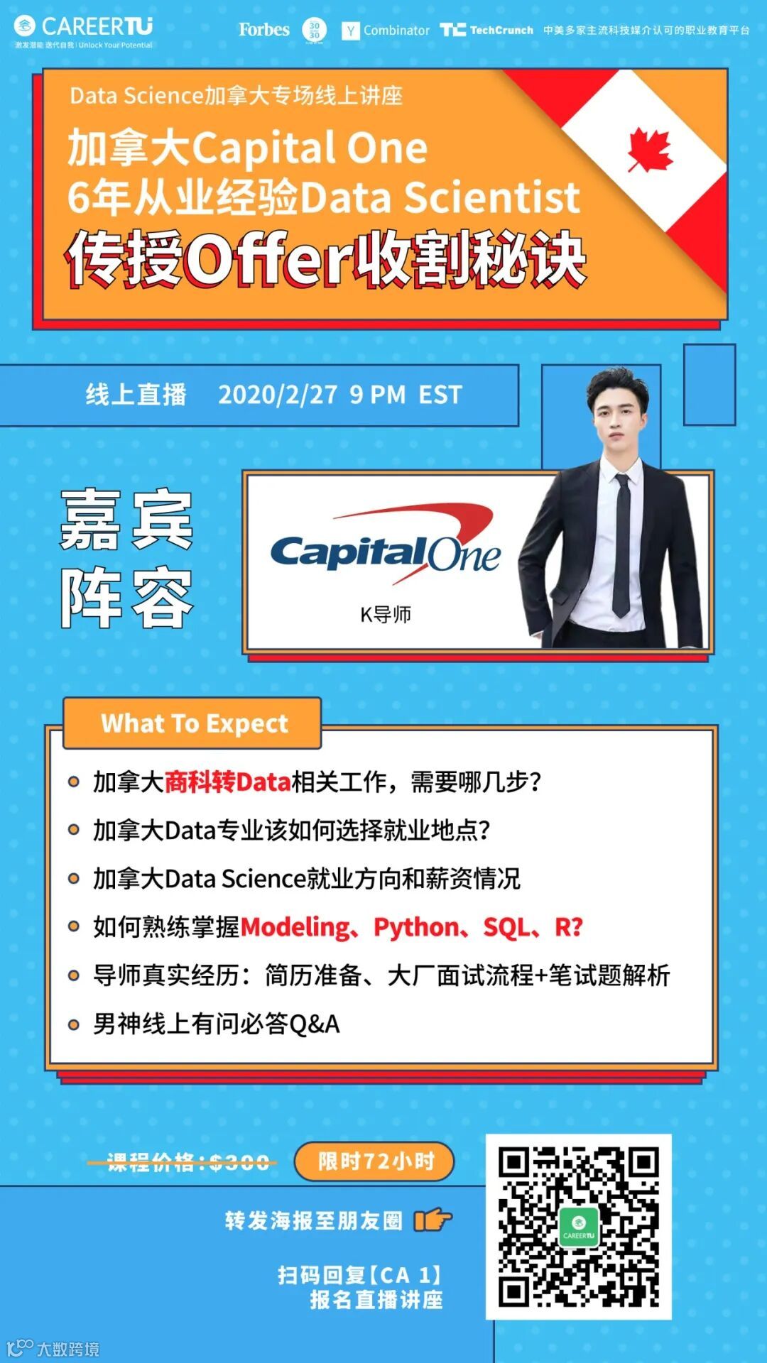 在加拿大求职,可能没有美国平均工资高,但是上升空间很大,后期跳槽也有很多机会。针对想在加拿大求职或没有明确求职目标的同学,都可以关注加拿大的求职信息。我们也特意的请到在加拿大CapitalOne 6年从业经验Data Scientist传授Offer收割秘诀。