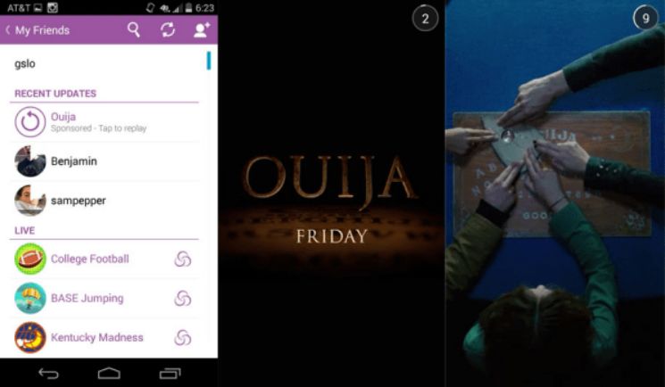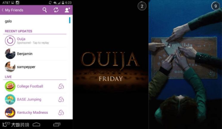 10 月,Snapchat 首次对广告 (Snap Ads) 进行了尝试。第一个广告是一段宣传恐怖电影《死亡占卜》(Ouija) 的短视频。广告的投放模式是很讲究的:首先,这些广告出现在 Stories 置顶当中。