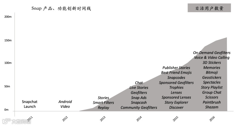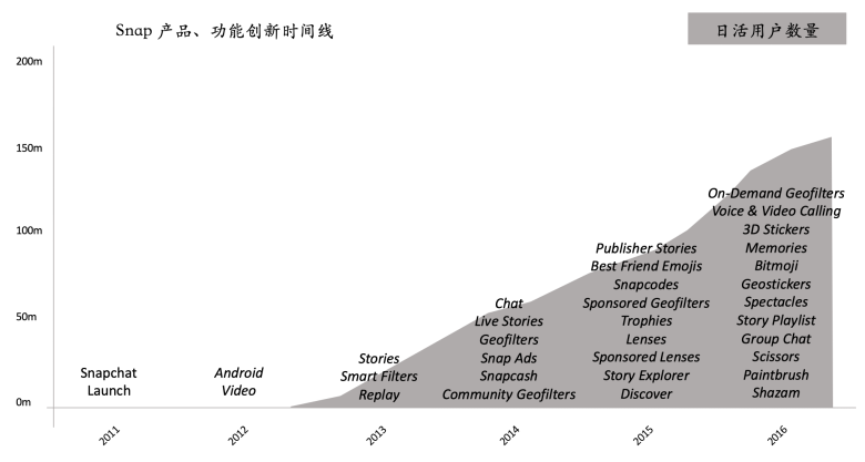 但与其说它是一个智能硬件产品公司,我觉得 snapchat 的核心实力来源于它在用户洞察和内容产品的不断创新。基于深刻的用户洞察,研发高相关性的内容产品,增强用户粘性,并进行盈利实验。下图展示了 Snapchat 的产品创新时间线以及日活用户数量: