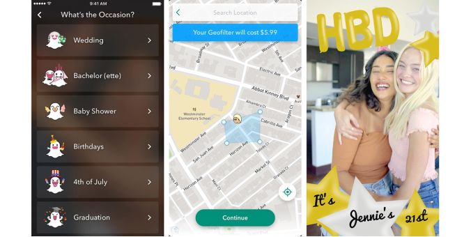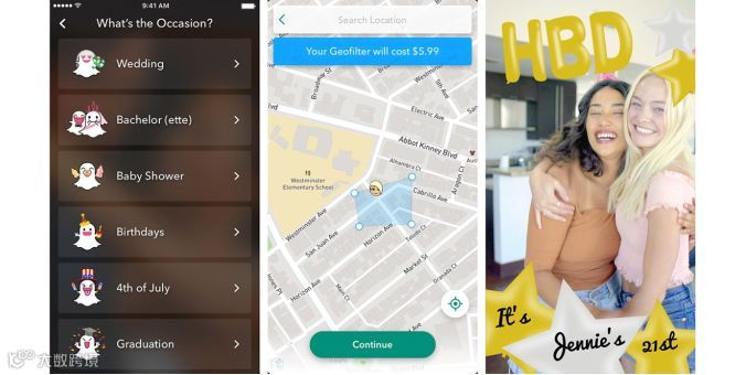 同年 7 月,Snapchat 又推出了 Geofilters 功能,即基于地理位置的滤镜功能。用户只有在特定位置才能触发特定滤镜。比如说,当用户在迪士尼乐园时,才能看到和使用迪士尼主题的滤镜和贴画等元素。这再次为 Snapchat 带来了一种可能的收入来源。其后又有衍生的 On-demand Geofilters 及 Community Geofilters。