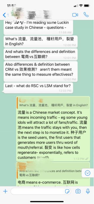 老板能读中文,于是我给她看了我以前做过的一篇关于瑞幸的 research。这一下开启了她的好奇心,又追问:啥叫流量?流量池?种子用户?
