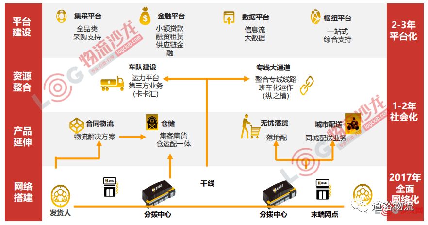 核心通过建立加盟门店,收揽客户货源;直营分拨中心+运力自有+金融+合资多方式整合;利用平台做批发,让利专线与加盟商,从而快速构建起了一张铺设全国的货物流通网络。