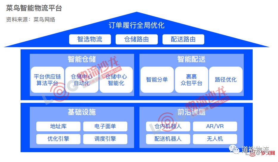 在基础层,通过底层地址库、电子面单、数据推送等技术,创造标准化订单管理标准,连接平台合作伙伴。在业务层,以数据、智能算法算法与云服务,为物流业务提供技术支持,提升仓、干、配运作效率;在优化层,统筹仓储、路由、运力网络,实现业务与订单驱动的物流网络全局优化。