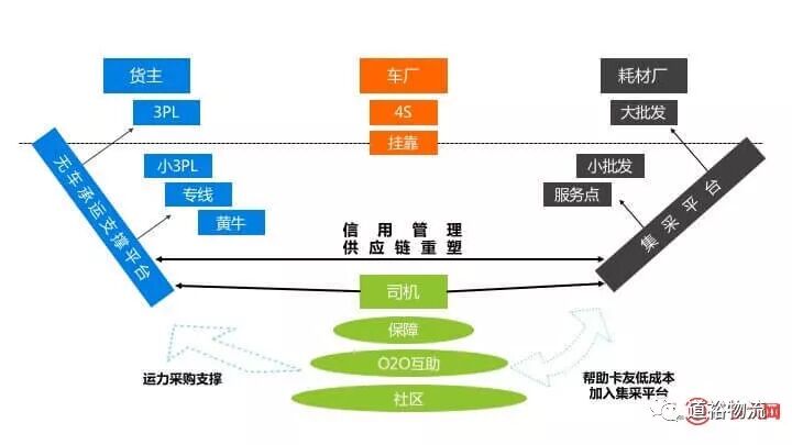 在路歌的生态模式中可以看到,卡车司机社区占据着很重要的地位。这个生态模式司机是在最底端,左边是无车承运的支撑平台,打通运力产业链,右边是卡车的后勤服务的集采平台,左右两边打通就是后勤产业链。而这两个产业链之所以能够打通是要靠下面绿色部分的卡车社区,需要通过信用管理、供应链重塑,去打通链接产业链盈利。