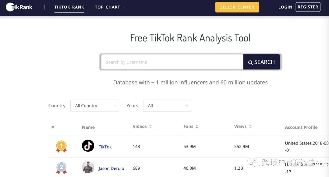 TikRank是一款免费的TikTok影响者分析工具。它的目的很简单——帮助热心用户分析TikTok影响者的特征。与许多其他分析工具不同,TikRank非常基础。它提供了一个包含大约100 万影响者的数据库,用户可以在其中找到有关其观看次数、粉丝和视频数量的信息。