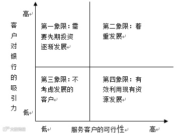 (1)第一象限:客户对银行的吸引力高,但服务客户的可行性低。通常是传统的大型国有企业,企业的固定资产庞大,实力雄厚,利润表现良好,地理位置及在行业内的声誉俱佳,对银行的吸引力极高,但这样的企业往往已经与其它的竞争对手合作多次,拥有一定的客户忠诚度,而且决策者不容易搞定,所以争夺客户的可能性比较小。需要客户经理经过前期的投资,逐渐稳定地发展。