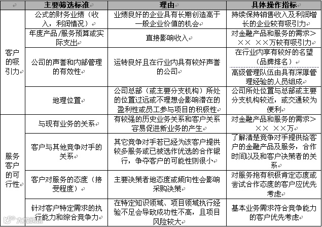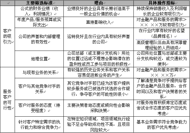 根据银行自身的情况和企业客户的竞争特点,可以从客户的吸引力及服务客户的可行性两方面来制定筛选潜在客户的标准。