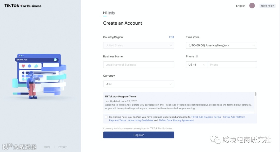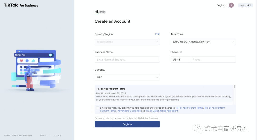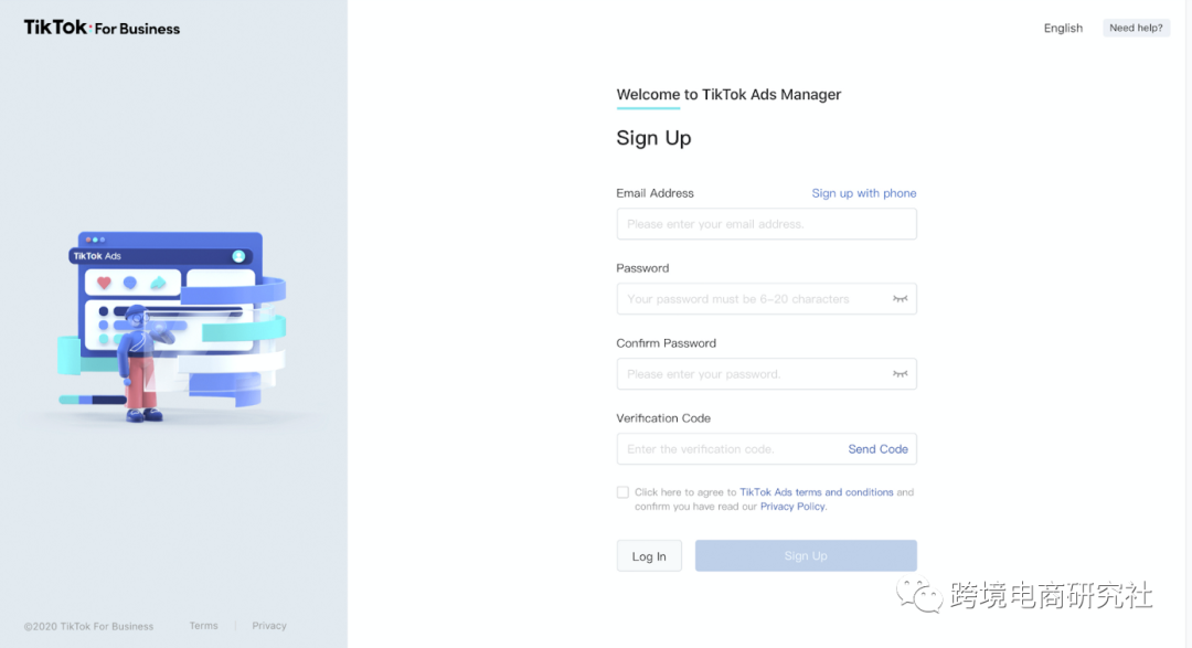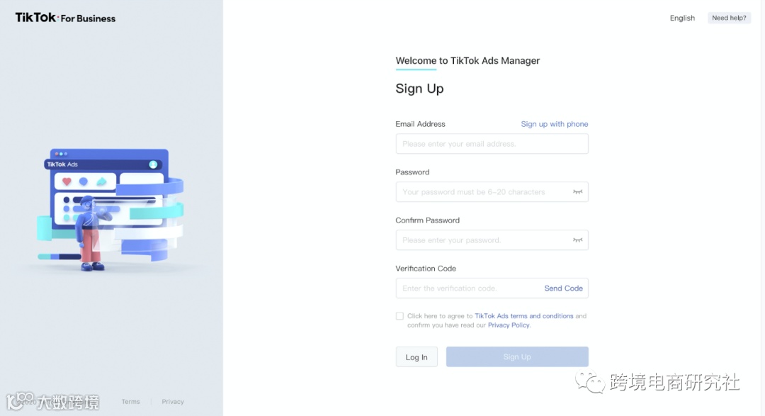 访问TikTok广告管理器并使用你的电子邮件、地址或电话号码创建帐户TikTok广告账户,同意TikTok广告条款和条件,然后单击“注册”。
