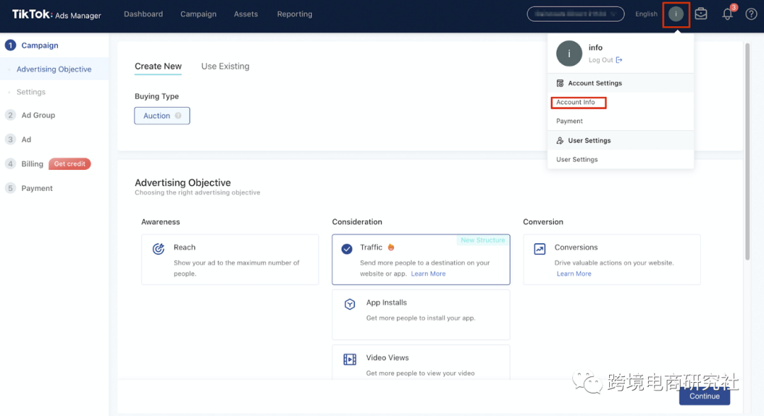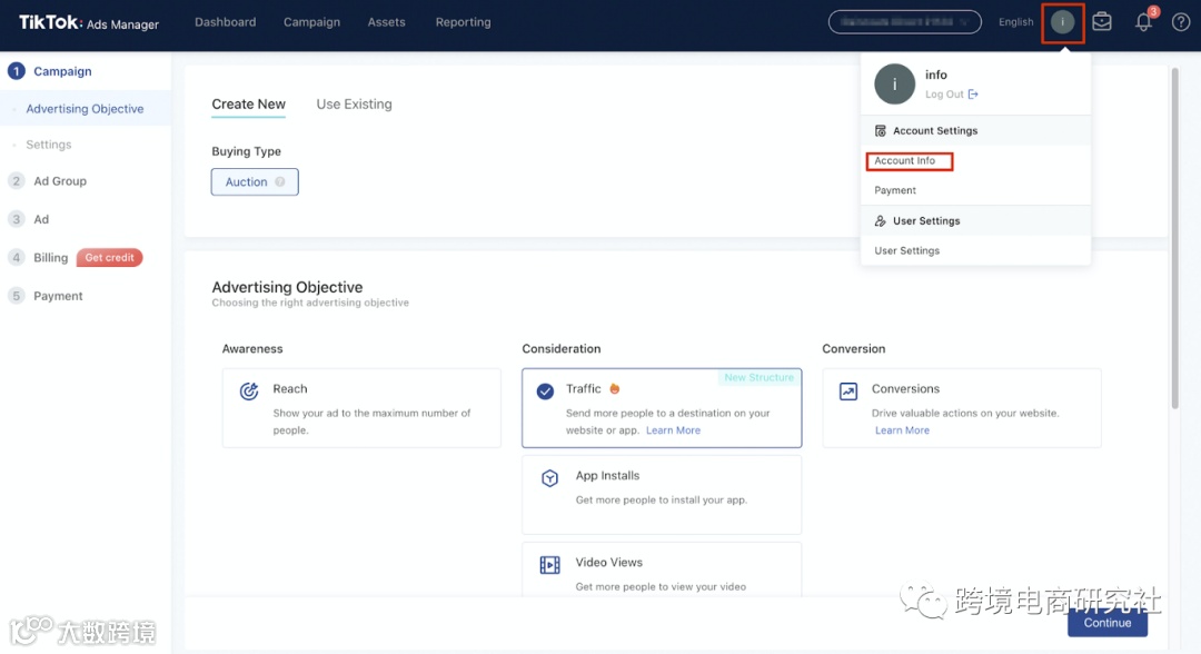 在TikTok广告管理器的仪表板中,单击“帐户设置”下的“帐户信息”。
