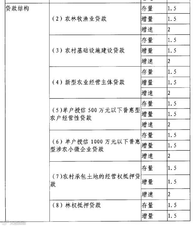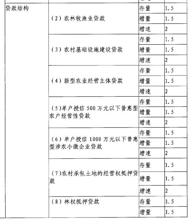 《办法》显示,对于上述五类定量、五类定性一级指标,均设置了相应的二级指标和三级指标。如贷款总量设置了存量、增量、增速3个三级指标,贷款结构设置了农林牧渔业贷款、农村基础设施建设贷款、新型农业经营主体贷款等8个二级指标,三级指标相同,均为存量、增量、增速。