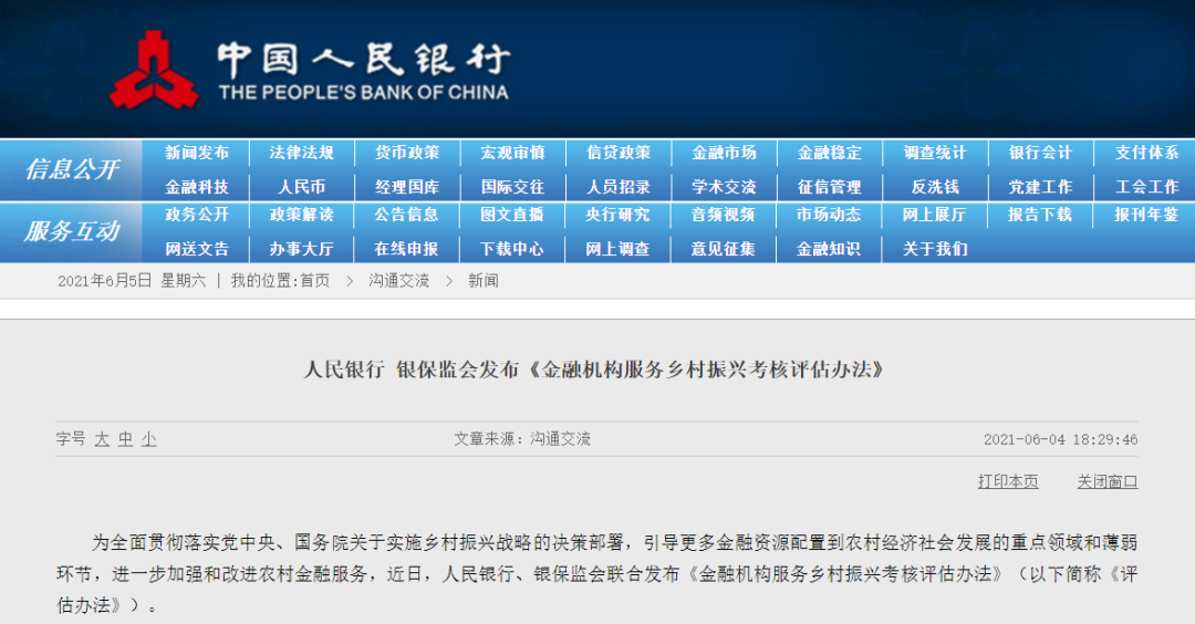 6月4日,中国人民银行、银保监会发布《金融机构服务乡村振兴考核评估办法》(以下简称《办法》),突出金融对乡村振兴重点领域和薄弱环节的支持。《办法》明确了评估对象、评估指标和方法、评估程序、评估结果和运用等具体内容,强调了对新型农业经营主体、小农户等的支持。