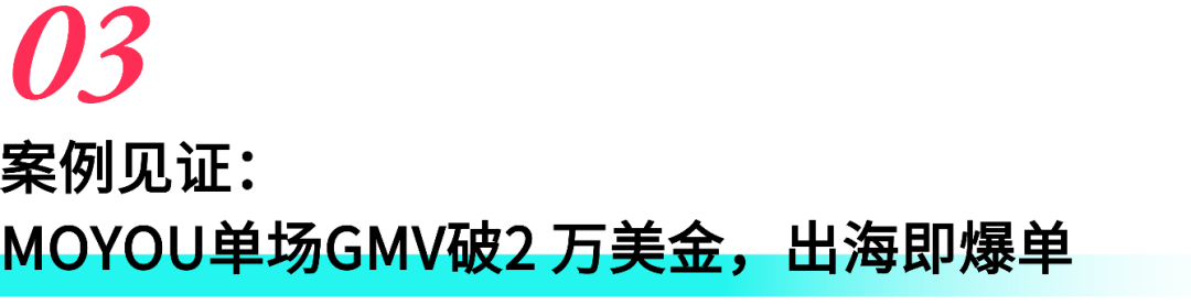 而平台的扶持政策,成为 MOYOU 爆发的关键推手:“平台的扶持资源和活动非常丰富,为我们的经营增长提供了有力支持。尤其是平台运营经理的一对一服务,对我们起到了很大的帮助。他会实时关注我们的运营状况,协助我们制定店铺增长策略。在启动初期,我们曾遇到达人对接困难的问题,而在平台运营经理的协助下,我们直接联系到了泰国千万级头部达人@win.william_official。难以想象,在我们品牌刚刚进入泰国市场之际,就能获得如此量级的主播支持。这使得MOYOU产品在今年7月首次登陆@win.william_official直播间,就创下了单场GMV突破 2 万美元、库存当场售罄的亮眼成绩。”