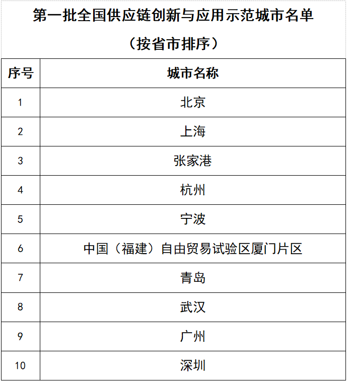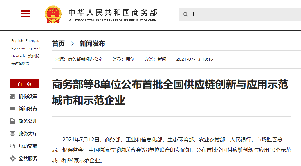 2021年7月12日,商务部、工业和信息化部、生态环境部、农业农村部、人民银行、市场监管总局、银保监会、中国物流与采购联合会等8单位联合印发通知,公布首批全国供应链创新与应用10个示范城市和94家示范企业。