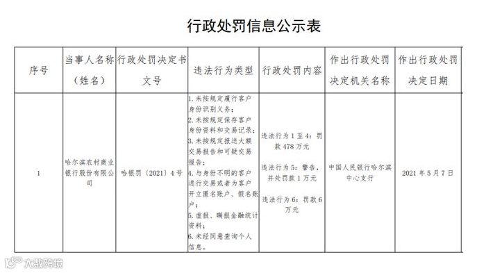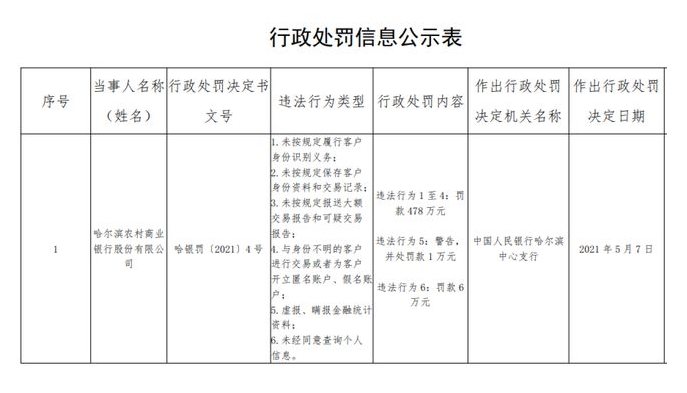 5月14日,中国人民银行哈尔滨中心支行发布的行政处罚信息公示表显示,哈尔滨农村商业银行被合计罚款485万元。