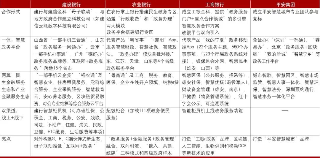 商业银行在机构客户生态圈构建方面已有若干实践,它们借助政务服务数字化转型的契机,协助政府搭建涵盖社保、公积金、工商、税务、公安、司法、不动产、住建、交通、教育、军队、民政、卫健、公共服务等服务的智慧政务平台,并引流至信贷业务、惠农服务、产业服务等配套金融服务(见表1)。