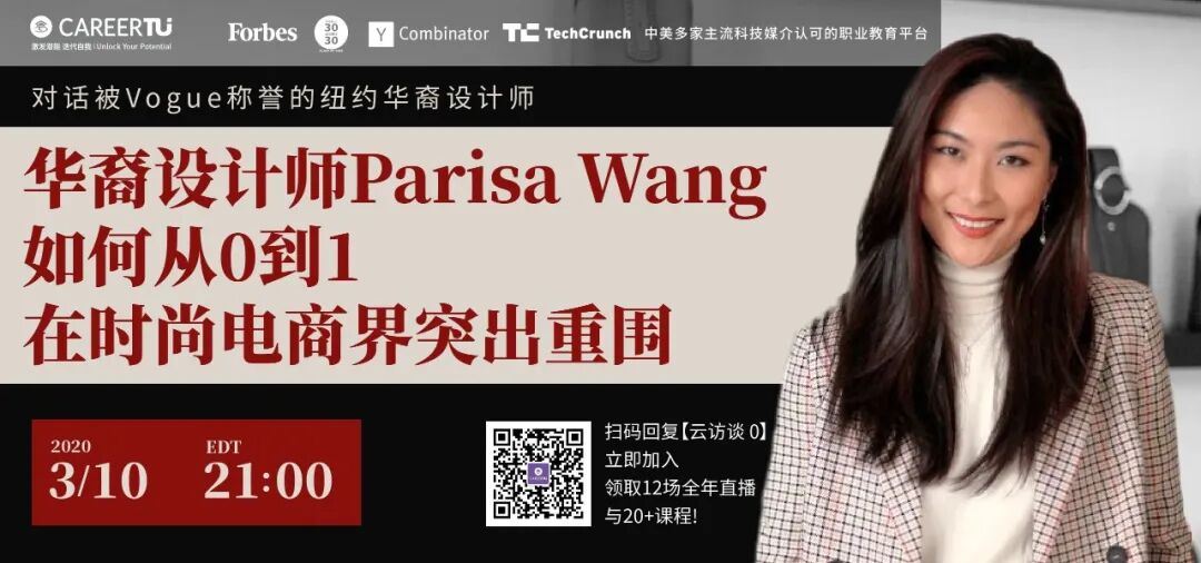 了解到了大家的疑问以后,我们请到了知名时尚电商创始人Parisa Wang参与我们的线上云访谈,解答留学生大大小小的迷茫,分享她一路走来的心路历程,希望能在这些时刻帮助大家走出迷茫。