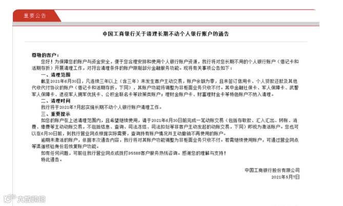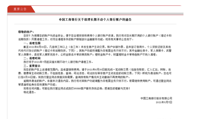 5月7日,工商银行通过官网发布清理长期不动个人银行账户的通告。为保障账户与资金安全,便于用户合理安排和使用个人银行账户资源,工行将对长期不用的个人银行账户(借记卡和活期存折)开展清理工作,对符合清理条件的账户限制部分金融服务功能。