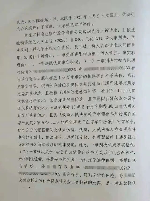 2020 年,孙女士再次状告枣庄农商银行薛城支行,法院认为,银行没有做到应尽的审核义务,应当支付孙女士 100 万元及利息。