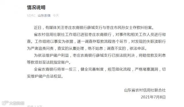 7 月 8 日,此事有了最新进展,山东省农村信用社联社发布消息,枣庄农商银行薛城支行已按法院判决,将赔偿款及利息等款项划至法院指定账户。