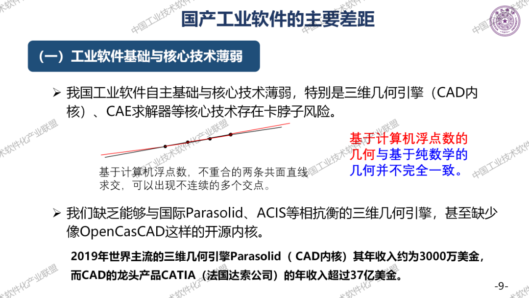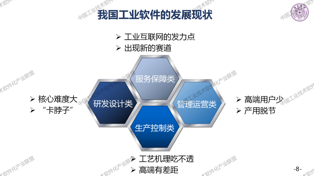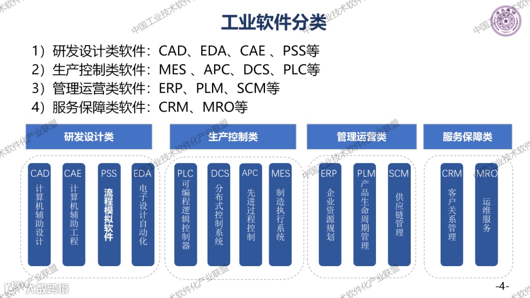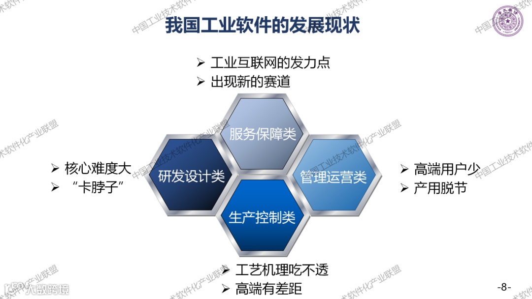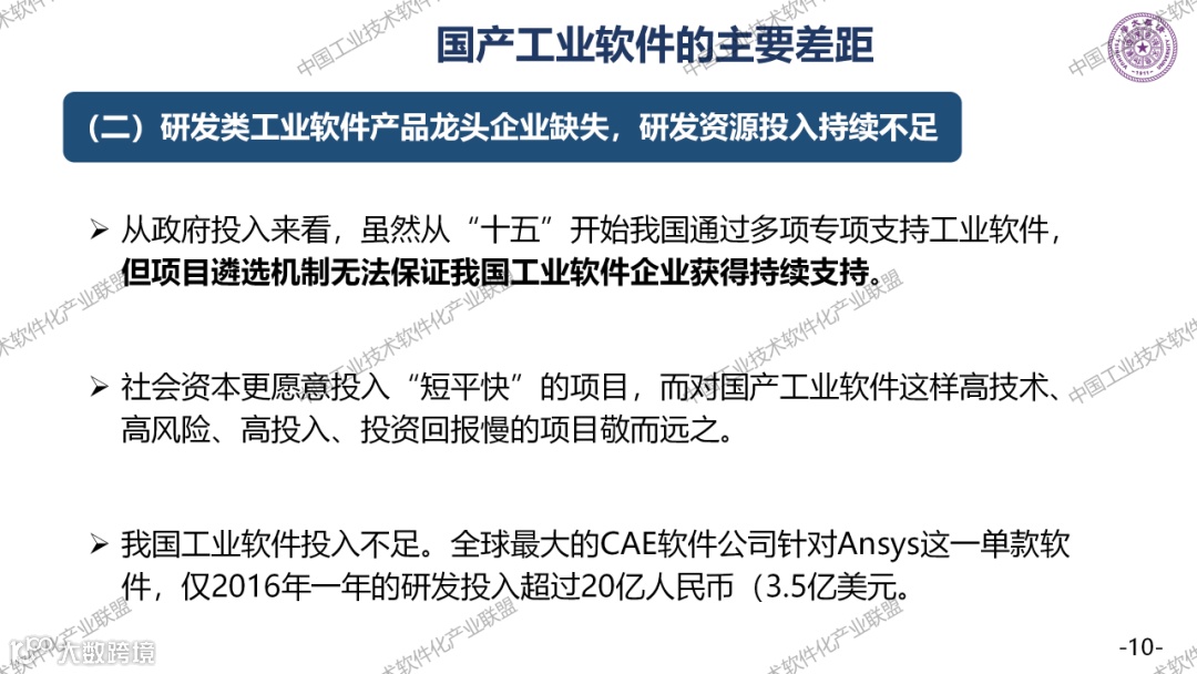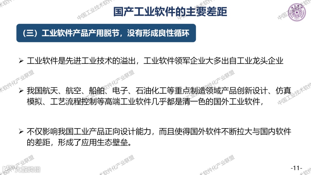 工业软件与国外的主要差距有很多,如果分成四大类,研发设计类卡脖子最深;生产控制类,高端用户少,容易产生脱节;运营管理类,包括ERP厂商缺少大型的龙头企业,基础已经非常好了。但是大企业给我们的应用场景太少了,我们是后发的。