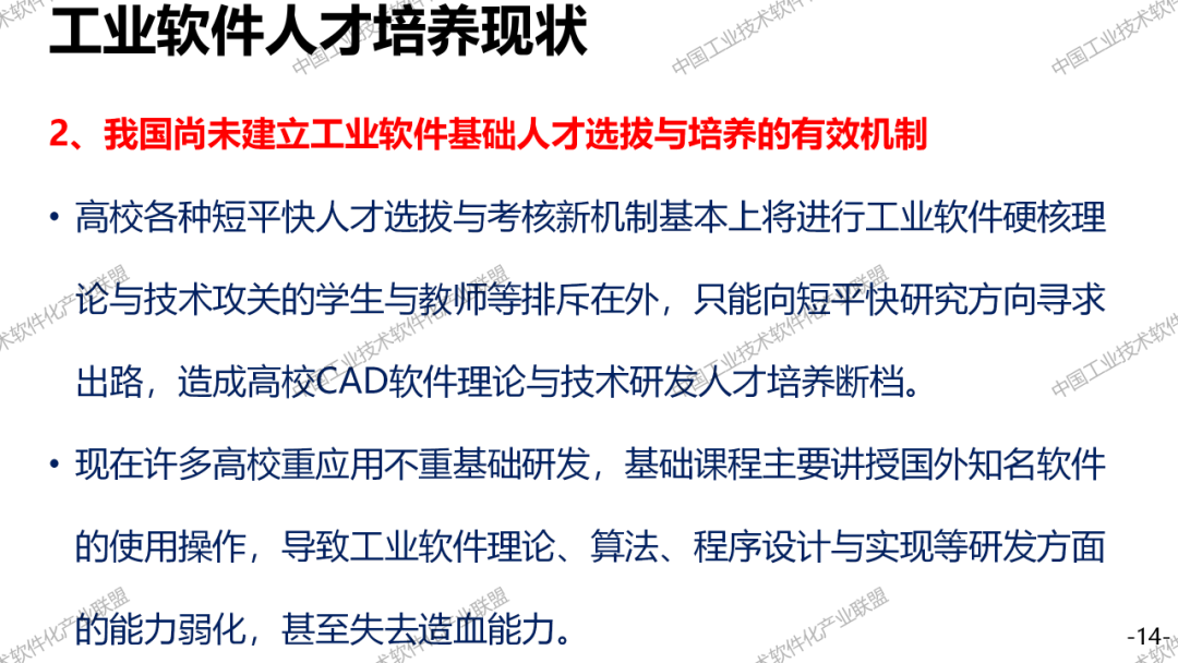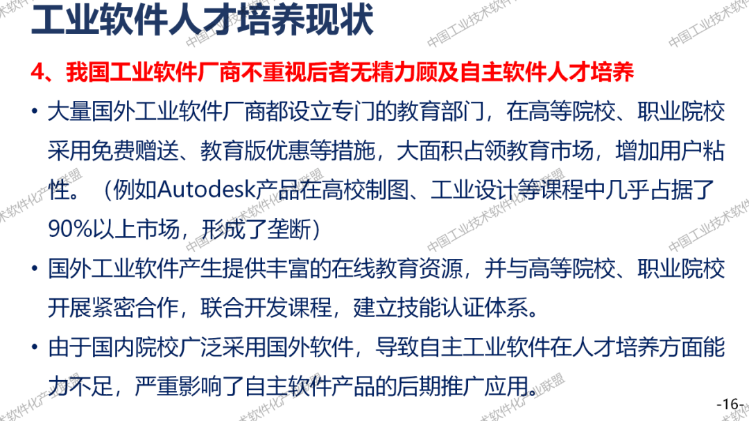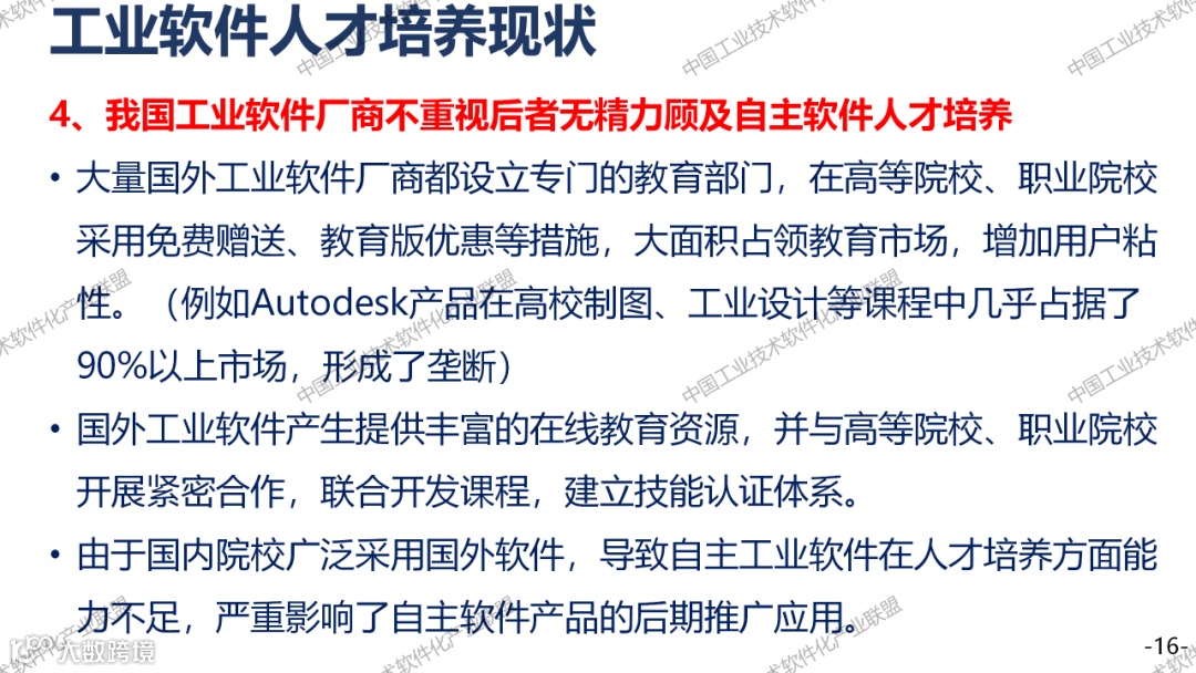 人才培养方面,我国大学以前的教育,基本上没有工业软件。工业软件研发人才严重匮乏,特别是复合型的人才。工业软件厂商因为比较弱小,没有精力来搞人才培养。国外的Autodesk致力于教育事业,人家特别重视这件事情。