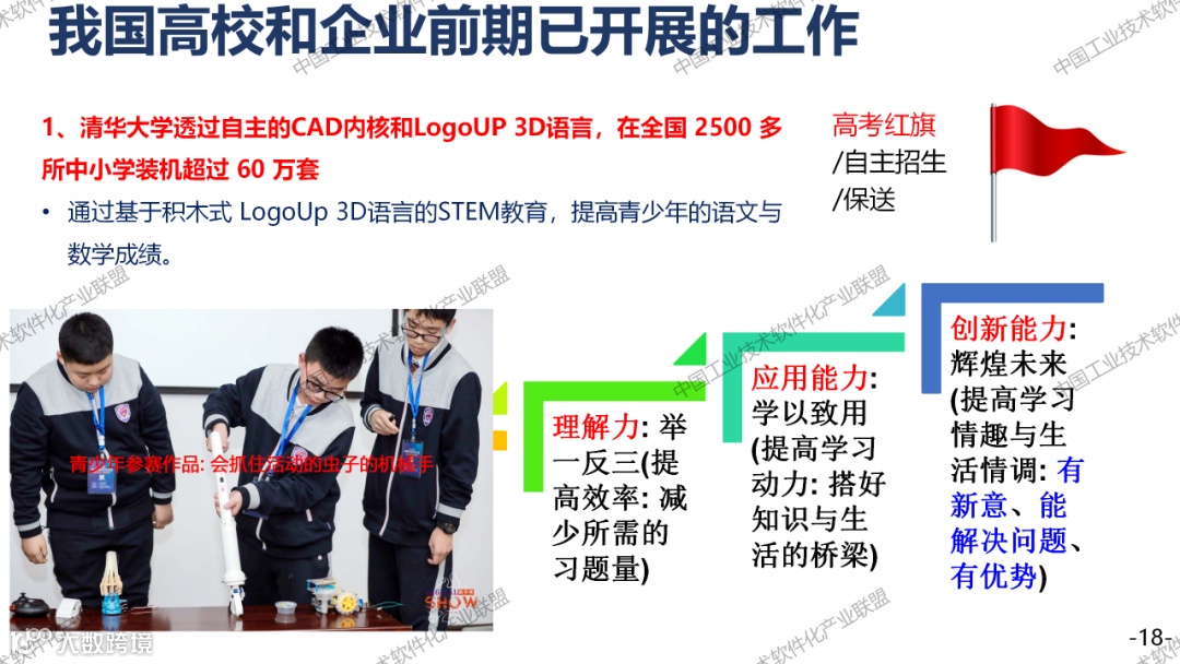 清华大学软件学院想做一件事情,用LogoUp3D语言,在全国2500所学校做了一些工作。高端的解决卡脖子的人才培养,还不太够用。工业大家一般都不喜欢开源,但是做工业的核心软件的,我认为还是要开源。CAD的内核大家觉得很难,但是真的不赚钱,可是上面的应用软件很挣钱,内核我还是希望大家能够开源,因为它本来就是不挣钱,底层的作用很大。