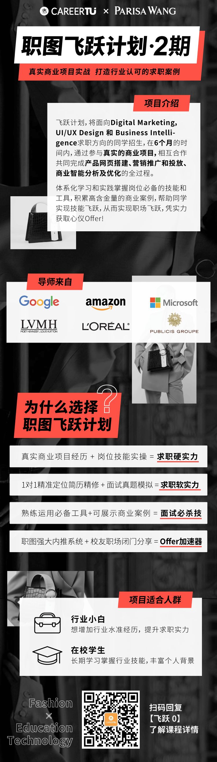 近期,职图推出了飞跃计划远程实习项目,更是携手纽约时尚电商Parisa Wang推出联名合作款,飞跃计划Business Intelligence 实习方向的学员,将参与到联名款的商业智能分析和优化,和飞跃计划Digital Marekting实习方向,UIUX Design实习方向的学员,共同合作完成联名款的商业推广。