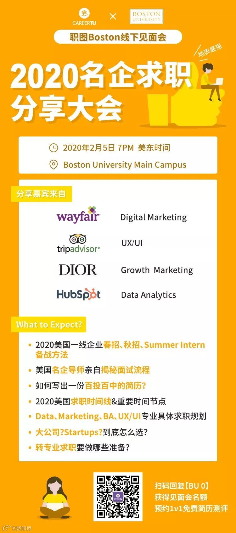 所以,2月5日,职图特别请到了来自Wayfair, Tripadvisor, Dior, HubSpot等波士顿一线公司资深在职导师,在Boston University的校园和大家分享Digital Marketing, UXUI, Business Intelligence 以及Data Science的2020求职新动向。