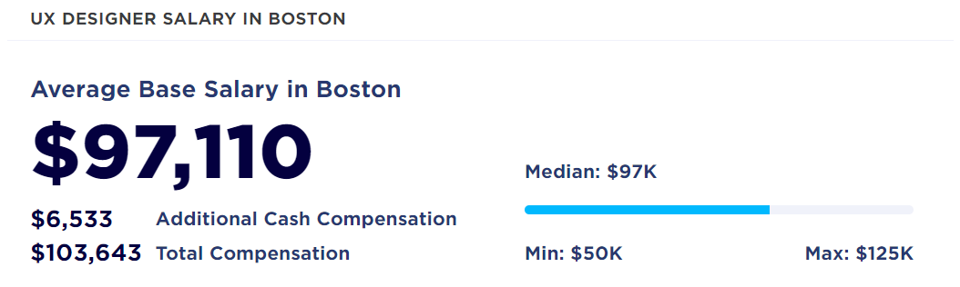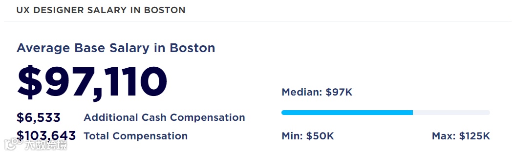 在波士顿,UX设计师的平均工资是97,110美元,平均额外现金报酬为6,533美元,平均总薪酬是103,643美元。在不同行业中,UX/UI Designer岗位工资给的最高的还是互联网公司,像Facebook和Google这些公司都有非常好的Package,一些传统行业薪资位居其次。再往下就是独立设计公司和游戏公司,这类公司给Designer地薪酬就相对较低。