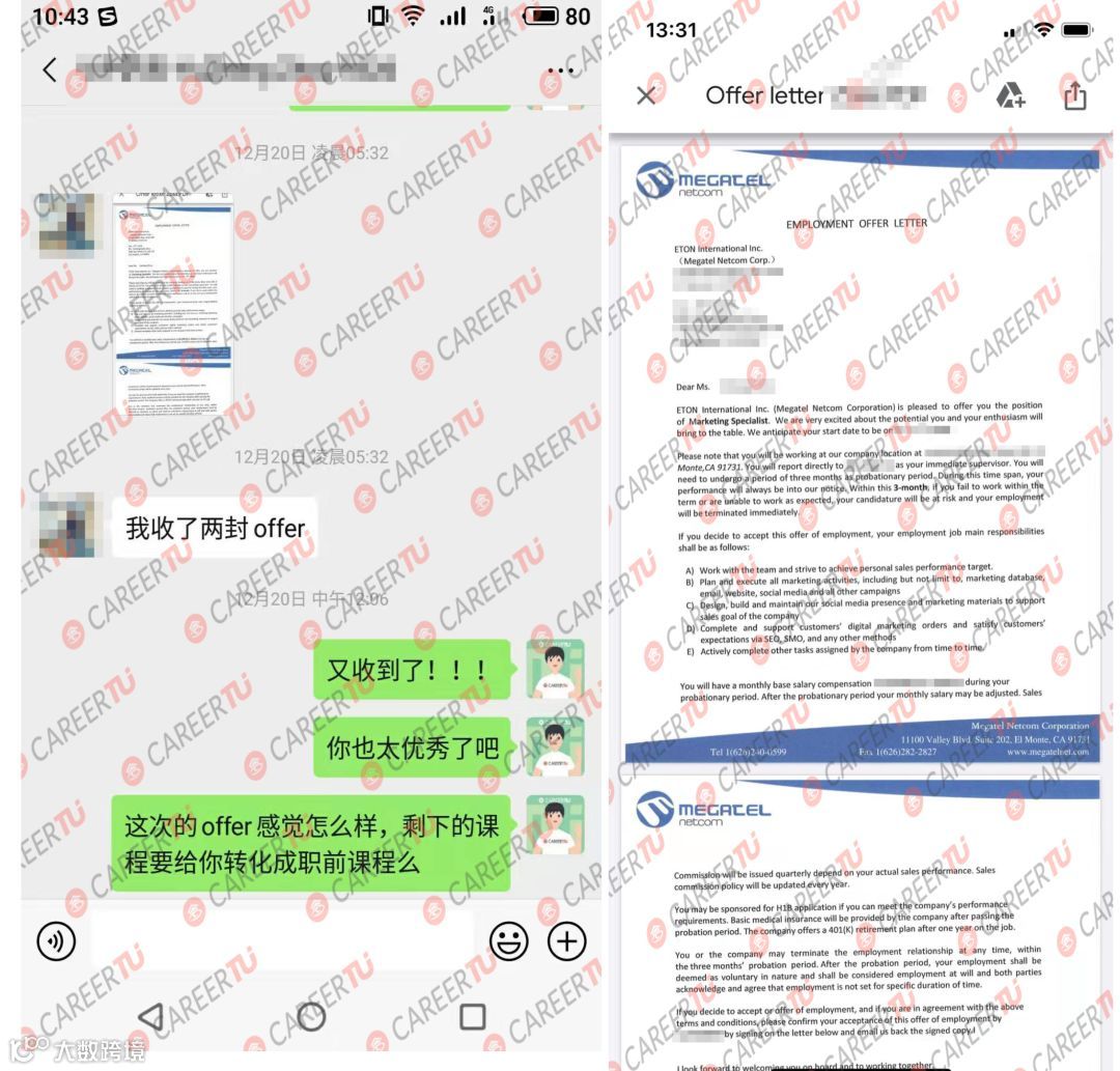 恭喜职图就读于Northwestern University的Y学员获得ETON International的Marketing Specialist 全职Offer!Y学员研究生专业为MS in Journalism,在加入职图项目后,职图教学组为其教学组组长导师S导师进行一对一辅导。在加入职图项目后,教学组老师以及一对一导师帮助Y学员清晰地定位求职方向,仔细解析职位JD,根据不同职位JD个性化简历。通过职图的金牌集训营课程以及与企业合作的实战项目,帮助她融会贯通行业基本知识,提升实操技能,与企业进行成果展示,并将此灵活运用到case study的面试环节中。最终在她的努力下,和与职图的积极配合,帮助她成功拿下这份全职Offer!这也是Y同学本月在职图斩获的第二枚全职offer了!祝愿Y学员在接下来的工作中能获得更好的职业发展!