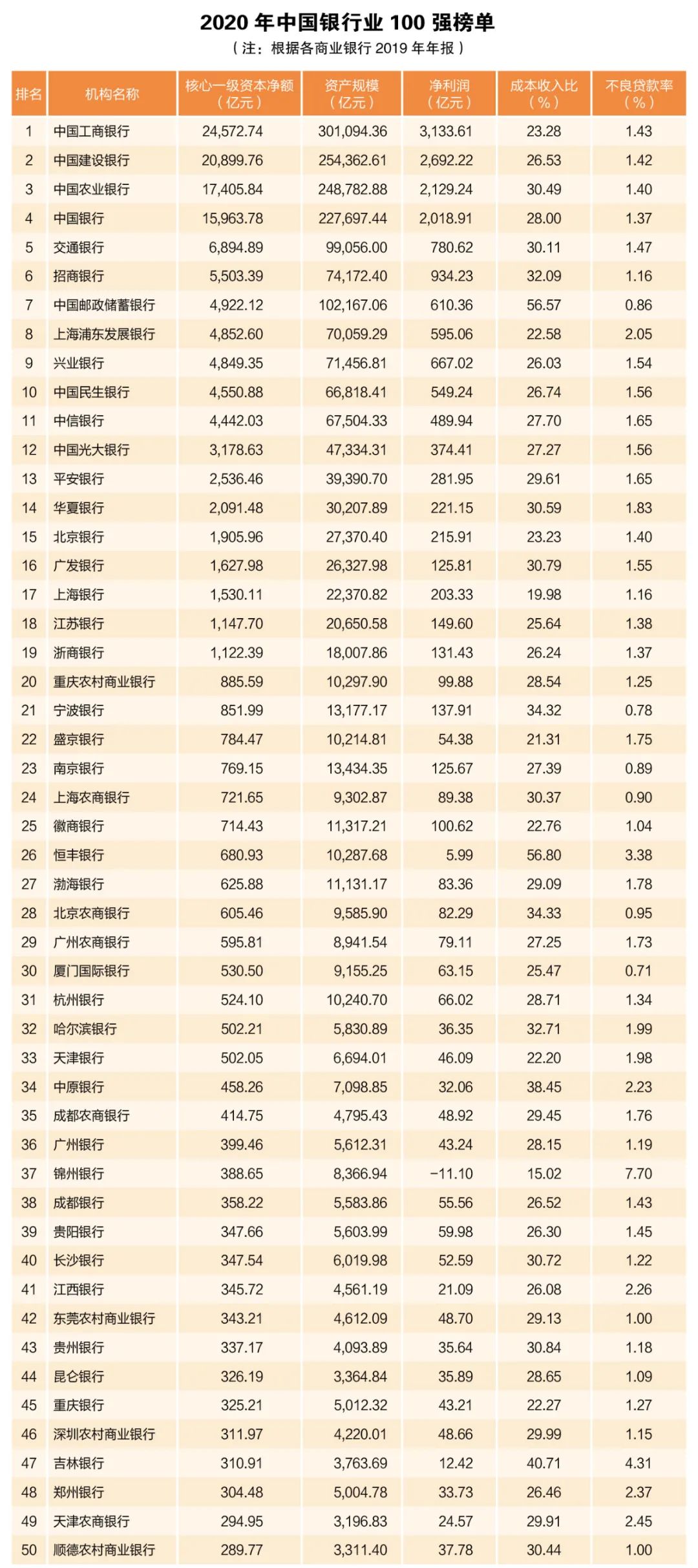 为积极发挥社会组织平台作用,推动银行业实现高质量发展,中国银行业协会连续5年发布“中国银行业100强榜单”。本榜单遵循简单、客观、专业原则,参考巴塞尔协议Ⅲ和监管机构相关要求,按核心一级资本净额排序,并附加资产规模、净利润、成本收入比、不良贷款率等指标作为参考。榜单数据主要来源于各商业银行2019年公开年报,并覆盖所有中资商业银行,具有较高的权威性、客观性和专业性。本年度上榜100家银行资产总和占商业银行总资产的90.5%,创造了商业银行95.0%的净利润。