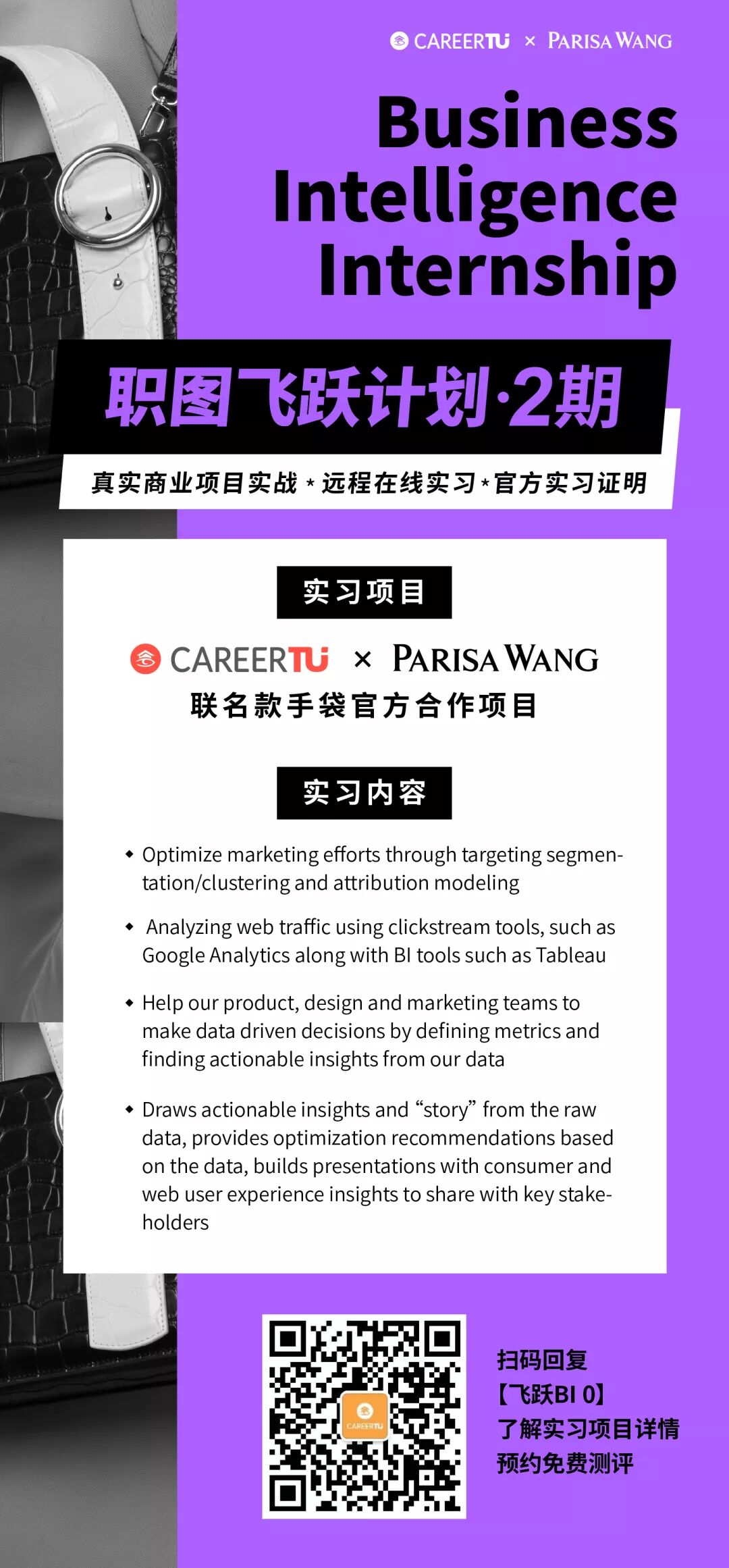 而Grace学姐作为职图 X Parisa Wang 联名款合作事业部的官方代言人,邀请那些想要获得高质量的实习经历、有较长求职准备期、想要学习掌握扎实的业界技能的同学们,都来报名加入飞跃计划,成为事业部的一员!