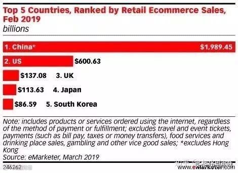 根据eMarketer统计数据,全球电商市场主要是由中、美、英、日、韩五国组成。除了中美之外,排名第三的英国市场销售额将达到1370.8亿美元,同比2018年增长近11%。