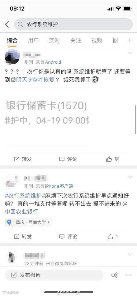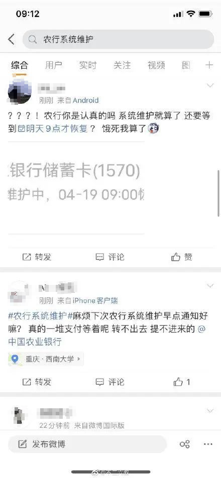 4月18日,多名网友在微博吐槽,遭遇农行系统维护导致外卖和外出就餐无法支付,此前农行官网发布《关于我行生产系统维护的公告(4月17日至18日)》。