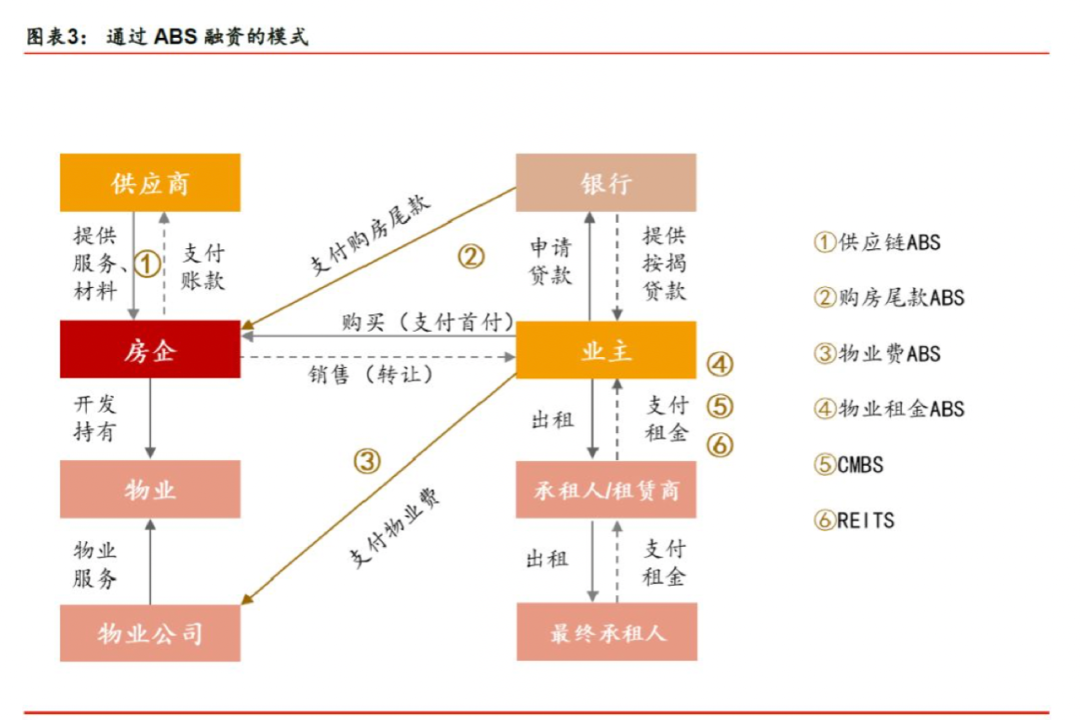 物业费ABS:在不动产存续过程中,物业公司与业主签订物业服务协议,形成应收物业费,这部分资产可供进行物业费ABS融资;