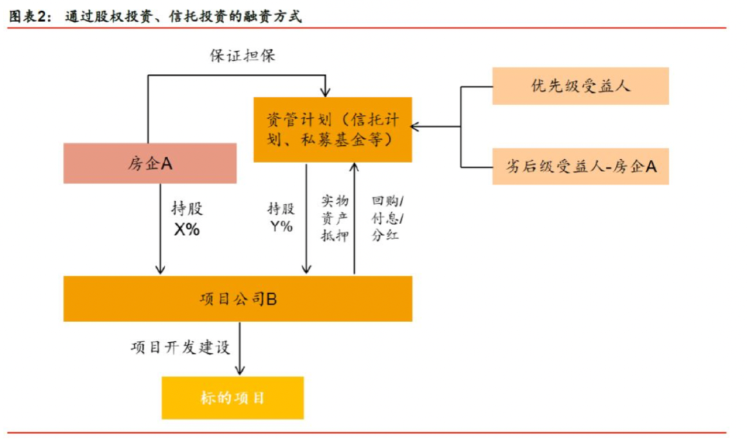 具体的融资过程为:投资者首先认购相关资管计划,如集合信托计划、私募基金进行认购,然后资管计划对房企的项目公司B进行投资,与房企A共同成立 SPV ,并与投资者约定固定回报或特殊分红条款(资管计划、信托集合产品、私募股权基金投资者享有资本金保障与项目优先收益,A或B享有劣后收益),并且房企A对资管计划进行担保,最终A或B根据合同约定条款,对投资者持有股权信托份额进行资本金回购。