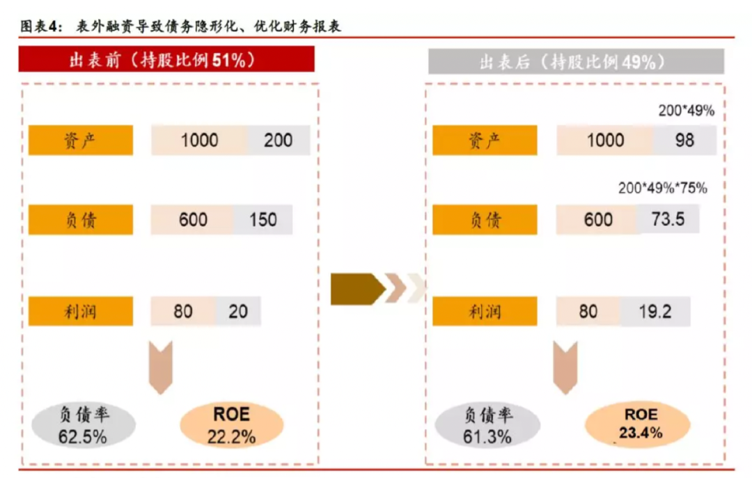 企业如果通过非并表公司来实现表外融资,意味着企业在财务报表中只剩下长期股权投资的科目,表外公司的杠杆率就不会体现在合并财务报表中。如果这部分公司的杠杆率高于公司整体,通过出表实现降低公司账面负债率的效果,使得公司表观的杠杆率不能真实的反映公司的实际债务负担。