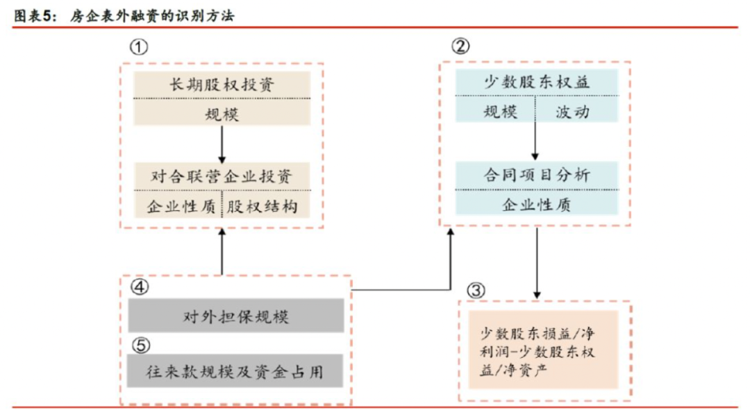 由于ABS的项目信息较为公开,在分析有息负债时仅需将企业的ABS融资还原为有息负债即可,在本文中我们不做重点的识别方法讨论。而其它几种房企表外融资模式较为复杂,对于房企表外融资的识别较为困难,五个方法被列举用来帮助投资者识别房企的表外融资。