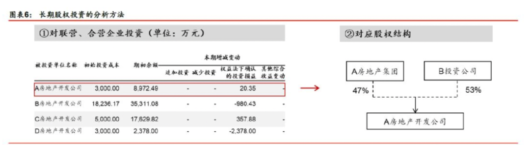 从合并报表角度看,如果房企选择不并表项目公司,则合并报表只体现房企方面的投资额,体现在长期股权投资中,具体可关注附注中联营、合营企业披露情况,提醒投资者切勿将房企的合联营企业完全视作单纯 的合作开发。