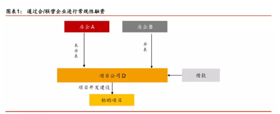房企合作开发增多导致通过合/联营企业进行融资的现象较为普遍。具体的融资模式为房企A、B等同时对项目开发企业D持有一定的股权,但是由于A的持股比例较低或对项目的实际控制力较弱,导致D体现为A的非并表企业,所以项目公司D进行的融资并未体现在房企A的报表中,而实际上房企A对这部分债务也有相应的偿还义务。